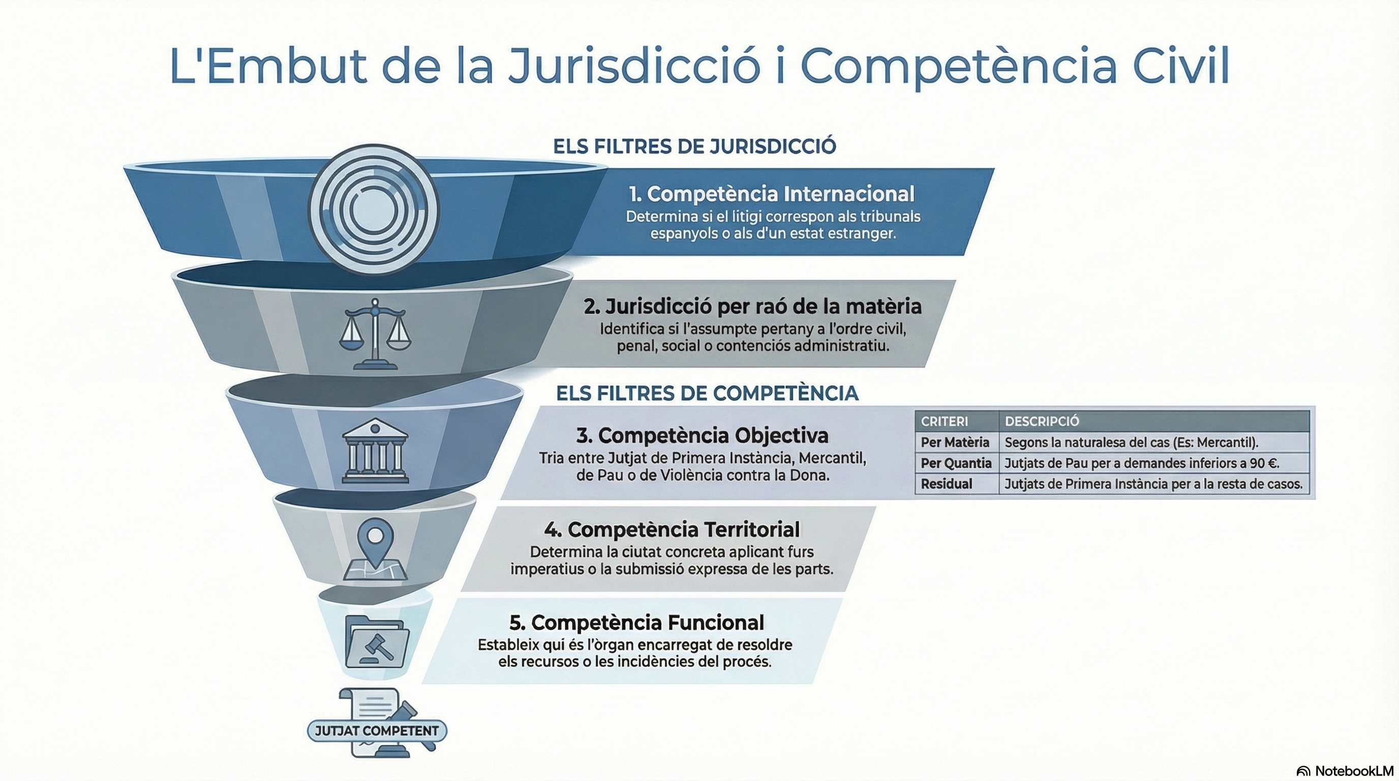 Guia visual per determinar la competència judicial segons matèria i criteris processals.